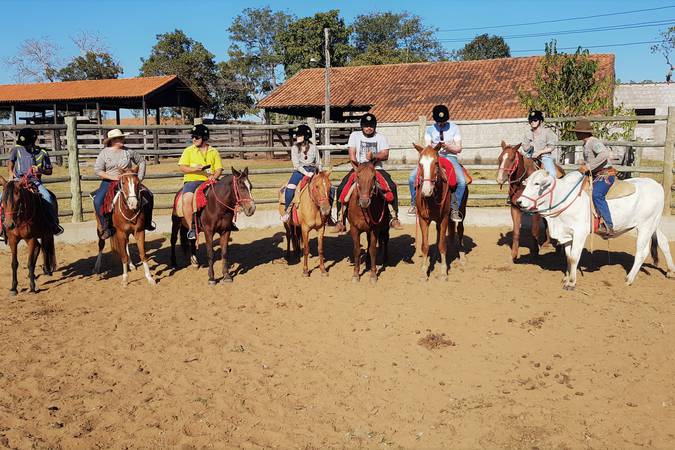 Cavalgue conduzindo o gado pelas estradas da fazenda, vivenciando o dia do dia de um peão no Pantanal! Com o famoso almoço de comitiva incluso.